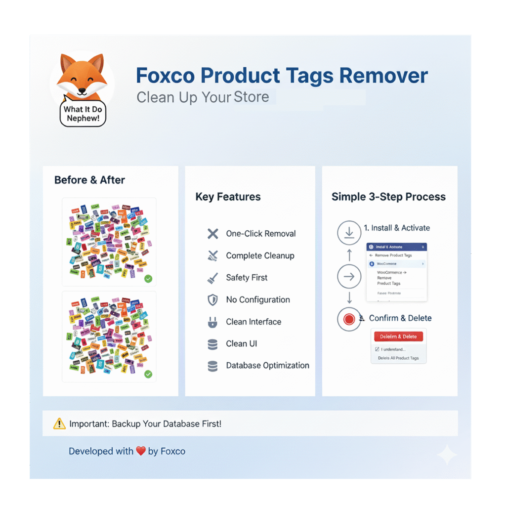 A professional tag remover WordPress plugin for Woo What It Do Nephew I got a little overzealous with a clients tags and ended up with about 16k unique tags for only 3500 products. The wp_termmeta file was humongous. Bad move Foxco. So I wanted to delete all of these tags and went to phpMyAdmin but then I thought this might be an issue others have experienced and why not create a simple plugin for it. So here’s the plugin: Foxco Product Tags Remover is a simple, safe tool that helps you clean up your WooCommerce store by removing all product tags in just a few clicks. If you’ve accumulated hundreds of unused tags or want to start fresh with your product organization, this plugin makes it easy. Key Features How It Works: Simple 3-Step Process What Gets Deleted? When you use this plugin, it will: Important: Your products, categories, attributes, and all other data remain untouched. Only product tags are affected. Before Using Important Safety Steps Who Should Use This Plugin? This plugin is perfect for: Technical Requirements Support Need help? Have questions? foxco@foxco.net Frequently Asked Questions Q: Can I undo the deletion?A: No, the deletion is permanent. This is why we strongly recommend backing up your database first. Q: Will this affect my products?A: Your products remain completely intact. Only the tag associations are removed. Q: Can I select which tags to delete?A: No, this plugin removes ALL product tags. If you need selective deletion, use WordPress’s built-in tag management. Q: Is it safe to use?A: Yes, when used properly. The plugin includes multiple safety checks and warnings. Just make sure to backup first. Q: Will it slow down my site?A: The plugin only runs when you actively use it. It has no impact on your site’s performance otherwise. Developed with by Foxco | Professional WordPress & WooCommerce Solutions